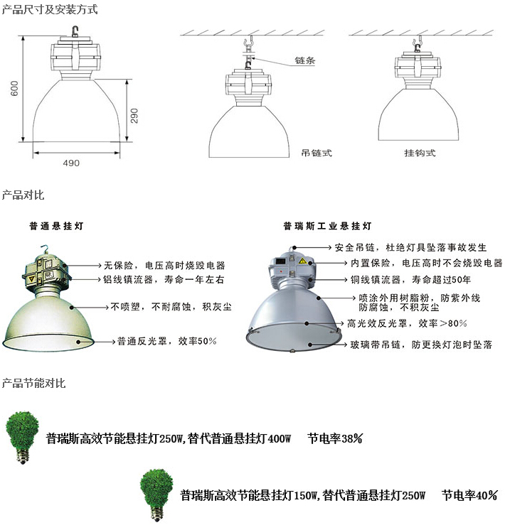 應用場所: 工業廠房、體育場、候車大廳、機場、博物館、商場、市、店鋪、各種專賣店。 電器配置: 》鎮流器:通過CE,CCC認證的帶過熱保護鎮流器,防止光源壽命終結時產生的整流效應而導致意外發生。 》觸發器:通過CE,CQC認證的三線串聯式TC105℃觸發器。 》電容器:通過CE,CQC,UL認證TCTC105℃的防爆自愈式鋁殼電容器。 可選用智能觸發器,具有自動檢測和延時關閉功能,能有效延長光源和電器的壽命,降低維護成本及避免維護時產生電氣安全隱患。 直接吊裝安裝、吊裝安裝、主電源線經安裝系統走線。 產品參數信息: