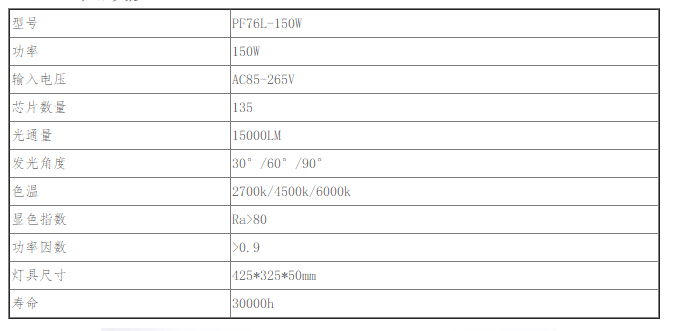 led泛光燈PF76L-150W產品特點: 1外殼采用高壓鑄鋁,散熱性能好 2薄燈體,體積小、重量輕,精致美觀 3燈體采用鋼化玻璃和防水硅膠密封,防護等級IP65 4光源均采用高流明LED芯片,內置恒流電源 5反光杯多種角度可選,既可用于泛光大面積照明也可用于投光遠距離照明。 適用范圍: 建筑物、體育場、廣場、碼頭、綠化照明、廣告、大廈外景、車站、鐵路、隧道、港口等戶外照明 led泛光燈PF76L-150W產品參數
